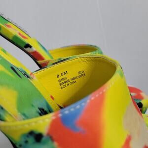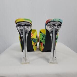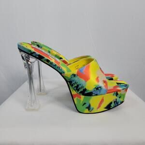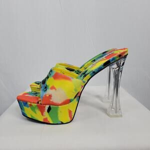 Cape Robbin Celia platform heels in a bright multicolor artsy abstract pattern with clear heels. They are in overall excellent condition. The only wear I see is minimal on the soles.