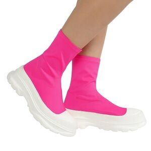Keywords: Cape Robbin boots, sock boots, chunky platform boots, hot pink booties, trendy ankle boots, street style footwear, stretchy boots, statement shoes, size 9 boots