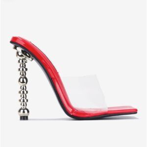 These Metro high heels are a unique and eye-catching statement piece. The odd shaped heel adds an extra touch of fashion-forward femininity, while the clear finish gives it a modern and contemporary feel. The padded insole ensures a comfortable fit, making them perfect for all-day wear.