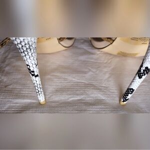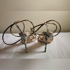 Chic nude heels with snake print straps. Perfect for a stylish look.