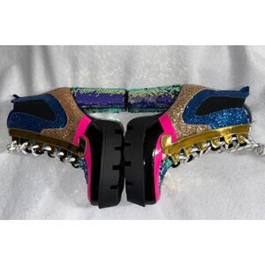 Step into the city with these stunning Cape Robbin Sparkle Mermaid Heel Boots in size 7. The almond toe and tie closure provide a comfortable fit, while the 1.5 inch platform height and ultra high heel (4 inches and higher) add some glam to any outfit. The multicolor vinyl upper material and mermaid pattern make these boots a standout addition to your shoe collection.
