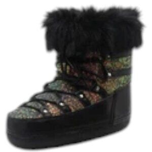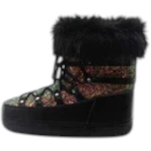 The Cape Robbin Women's Polar Black lace up Faux Fur Moon Boots in size 10 are stylish and comfortable winter boots perfect for casual occasions. Featuring a round toe, lace-up closure, and mid-calf shaft style, these boots are accented with faux fur trim, glitter, and lace details for added flair. The rubber outsole provides good traction, making them ideal for winter and fall seasons. With a blend of fabric materials and a flat heel style, these boots offer a trendy yet practical option for women looking to add a touch of festival or punk-inspired, Anime style to their wardrobe.