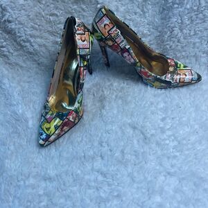 Cape Robbin patent multi color Magazine cover collage prints slip on heels pointed toe SZ9 .pre owned in good used condition signs of wear on the outer sole no scuffs clean see all pictures any questions please message.