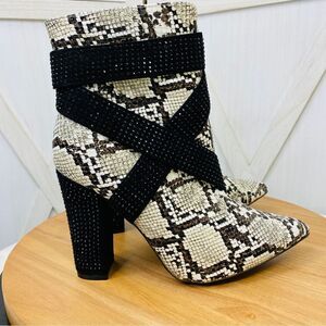 Cape Robbin Snake Skin Rhinestone Detail Heeled Ankle Boots Ivory Black 7.5