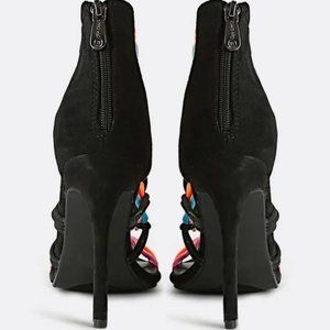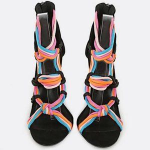 New, never worn sexy open toe, stiletto heel, with back zipper, black suede fabric on heels, with neon multi-colors (pink, blue, light pink). This sandal is a gladiator rope strappy style,.