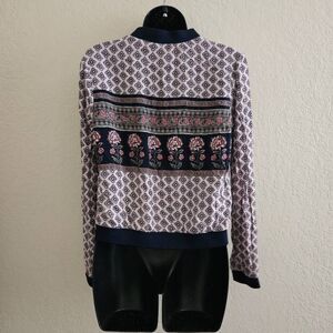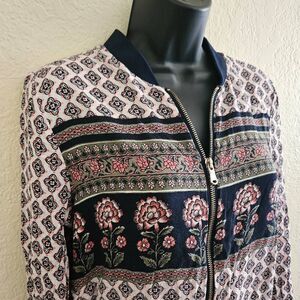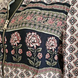 This is a full zip bomber jacket by Cape Juby. It features floral and geometric print in shades of pink, blue, and green. Inside is a solid white lining.
