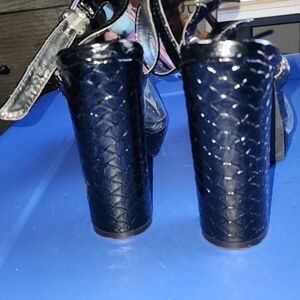 pointed toe clear and mock black croc ankle strap chunky heel platform