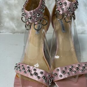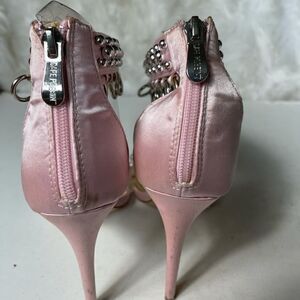 Cape Robin Suzzy-43 pink satin heels embellished with silver tone beads and silver tone hardwares back zipper closure size 10M pre owned in good used condition wear signs on the inner soles and transfer marks on the heels not very visible also the inner straps have some peelings see pictures any question please message.