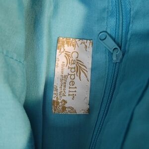This stylish handcrafted tote bag features a vibrant mix of blue and green hues.