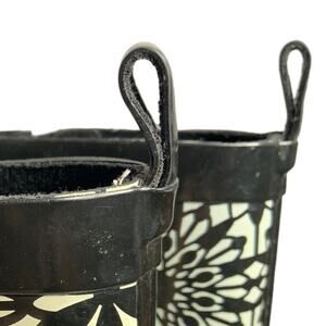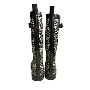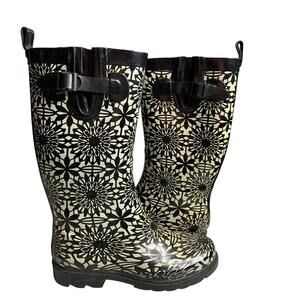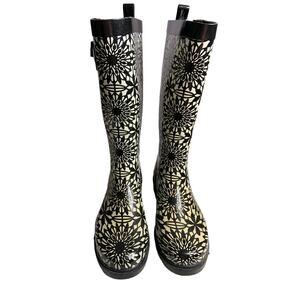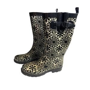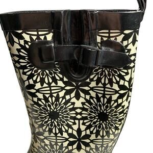 Capelli New York Women Sz 8 Tall Rain Boots Black White Floral Design Block Heel