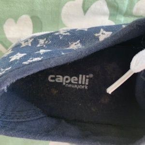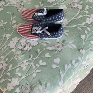 Capelli size 9. Red, white, and blue with white shoelaces.