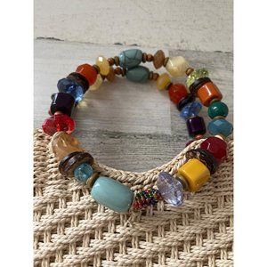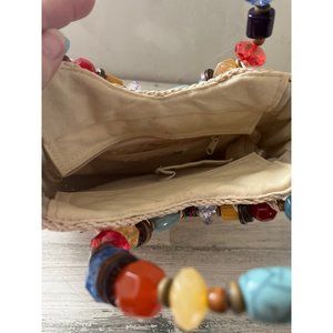Capelli Straworld Inc. woman’s straw bag with faux stones handles. Top has zipper. Inside has two cellphone pockets and zippered section. Handle has approximate 5” drop. Bag measures approximately 11”x8”x3.5”. Good pre-owned condition.