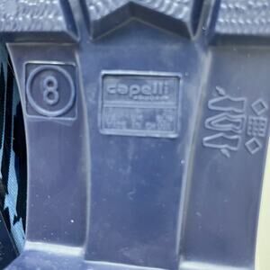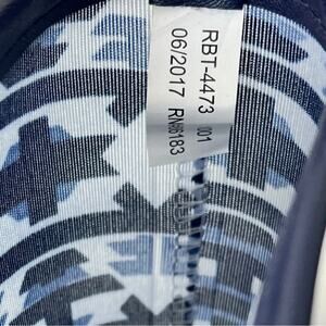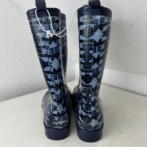 Varying shades of blue western design. Marks to the side of one boot. Have been tried on by me in the house, not worn outside.