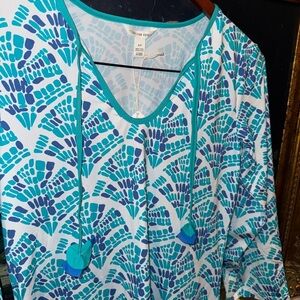 Capelton Road NEW Seaside Beach Dress Mosaic Waves Print UPF 50+ Swim Coverup S. Tassel ties. Stretchy nylon. 3/4 sleeves.