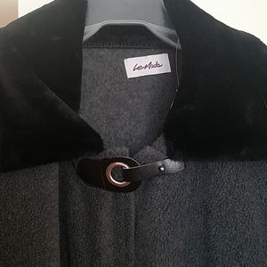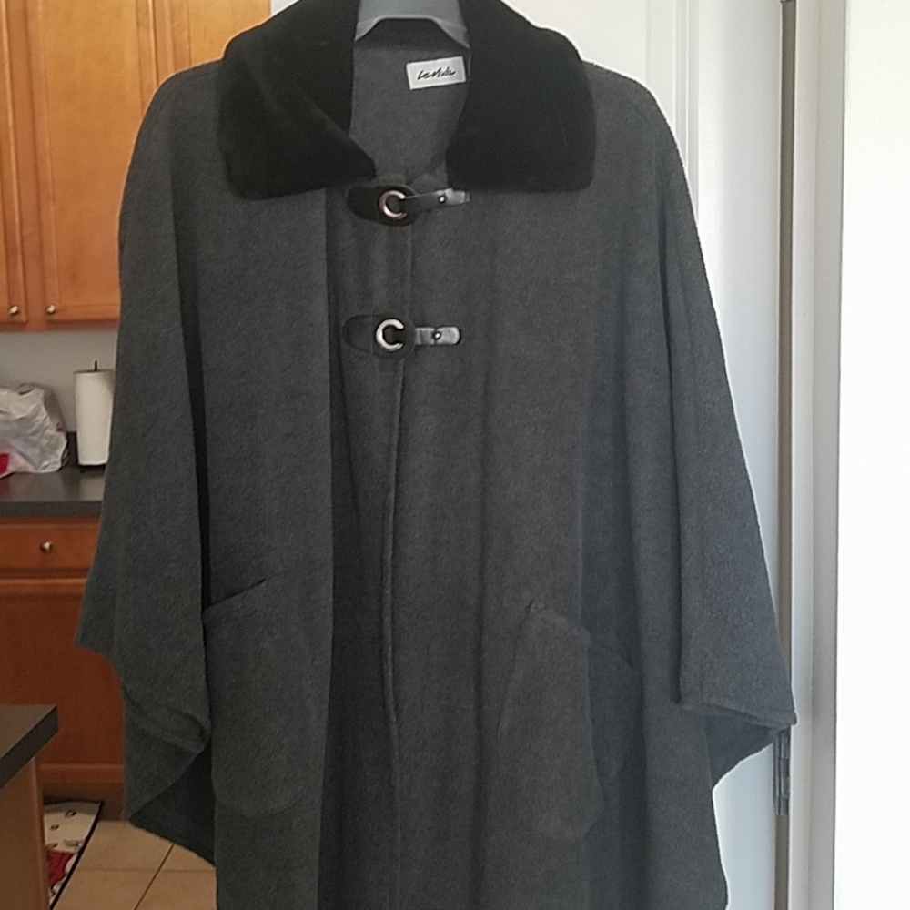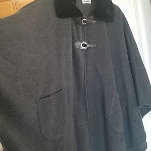 Dark gray fleece material with black fake fur collar. Perfect to throw on for a little extra warmth this winter!
