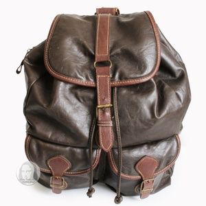 Preowned, vintage backpack or rucksack bag, made by Capezio, most likely in the 1980s. Made from smooth brown leatherette, it's trimmed in a cordovan-hued pebbled leather. Fully-lined in cloth, it fastens with push locks and has two small pouches on the front and the main compartment with access at the top or through a zipper on the side. The shoulder straps are removable and allow one to carry the bag crossbody or sling style, if so desired. Lightweight and easy to carry!!