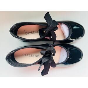 The Capezio tap shoe is the number one choice for a beginner tapper. Comes in shiny black patent leather. Adorable ribbon tie and peach cotton lining will inspire your little dancer to have Broadway sized dreams. Features foam padded footbed, collar and Achilles notch for added comfort and security. Introductory tappers will take their first steps with confidence.