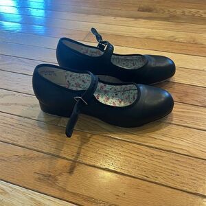Keywords: Capezio, Mary Jane, black shoes, leather, adjustable straps, metal taps, dance shoes, floral lining, buckle closure, women's shoes, activewear, closed toe, synthetic outsole, pre-owned, excellent condition.