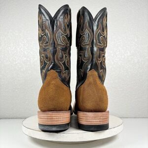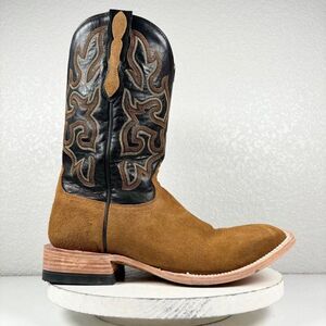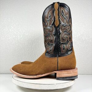 This listing is for an awesome pair of Lane Mens Capitan Cowboy Boots Sz 8 D. The style is Matador. They are brown rough out cow hide with a black shaft and Square Toe.