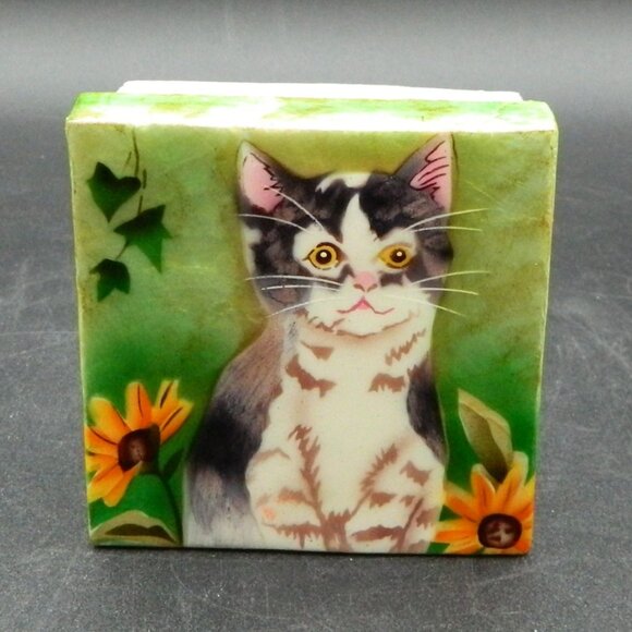 Beautiful keepsake trinket box handmade in the Philippines from the outer shells of farm raised Capiz aka Windowpane Oysters. The vibrant image of the kitten is airbrushed on by hand. The natural luster of the shell provides a stunning iridescent effect. Perfect for storing jewelry, as a gift on its own or with something special added, or as a decorative piece.