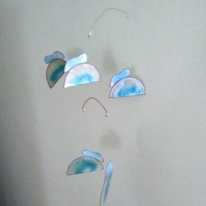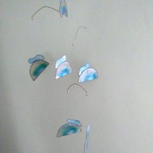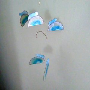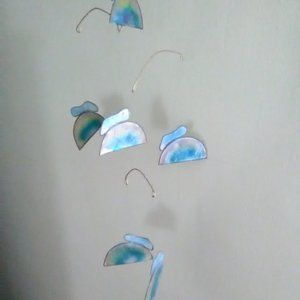 Vintage Capiz Shell Mobile...hangs 19" long...4 layers...rainbow toned...4 gold-toned 4" wide hangers with leaded 3"x2" shell pieces on nylon strings...no maker marks or IDs...pre-loved...***a few age blemishes and a small crack in one shell piece*** fair condition