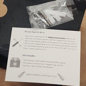 Caplord Wall Mounted Bottle Opener with Magnetic Cap Catcher Includes Hanging Accessories....Really Nice top of the Line Bottle Opener with a Great Lid Catch....Solid and Heavy...Will Probably Last a Lifetime.....Brand New in Box......