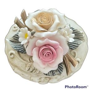 Vintage porcelain trinket box by Capodimonte. Certificate of authenticity in box. Never used. In excellent condition. Measurements are approximately 4” long by 3.5” high.