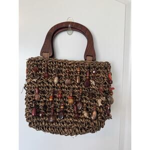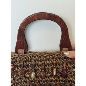 Cappelli Boho Beaded Handbag Woven Raffia Purse Wood Handle Resort Beach Bag VTG