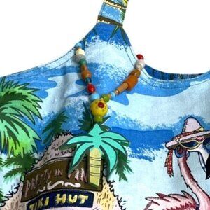 This tote bag offers a vibrant tropical design with a playful flamingo and tiki hut print, combining functionality and style. Durable and spacious for essentials. Measures 16"x10"