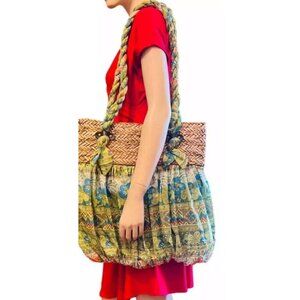 Introducing the Cappelli Straworld Bohemian Beach Y2K Bag, perfect for any occasion. This rectangular tote features a floral pattern with a green and blue color scheme, and a shoulder strap handle in a contrasting green color. The exterior is made of raffia material with blue hardware accents, while the interior is lined with green fabric.