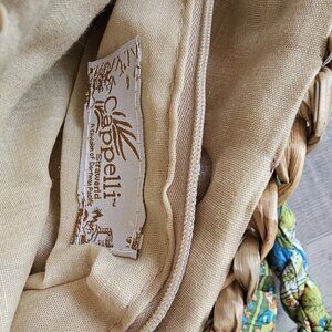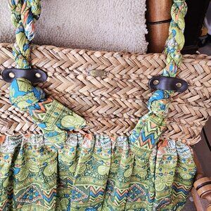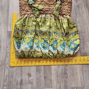 Introducing the Cappelli Straworld Bohemian Beach Y2K Bag, perfect for any occasion. This rectangular tote features a floral pattern with a green and blue color scheme, and a shoulder strap handle in a contrasting green color. The exterior is made of raffia material with blue hardware accents, while the interior is lined with green fabric.