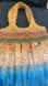 Charming tote with crochet design. Features yellow, orange, green purple, and blue tones. Ideal for casual outings.