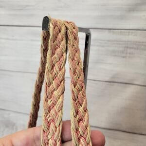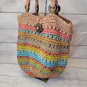 Comments: Beautiful bag is perfect for a warm weather vacation or regular summer use. Fully lined with 1 inner zipped pocket. Straps attached with brown wooden circles. Shoulder bag.