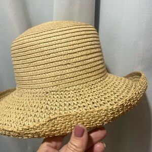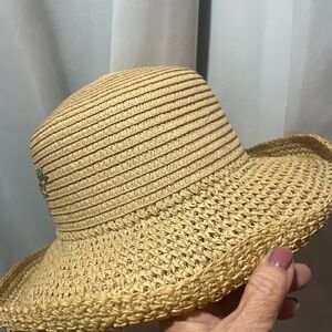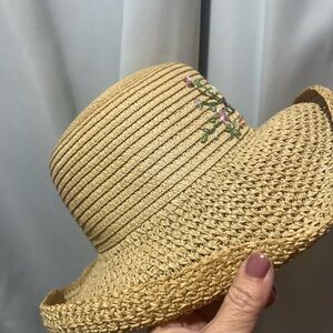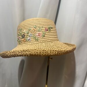 This stylish tan hat from Cappelli Straworld features a wide-brimmed design crafted from quality straw. Delicate embroidered floral details add a charming touch, making it perfect for sunny days. Its well-constructed weave ensures excellent sun protection while maintaining a fashionable look.