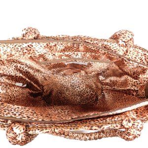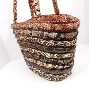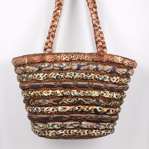 Beautiful tote bag with animal print fabric attached to a straw purse, braided dual straps and zip top closure.