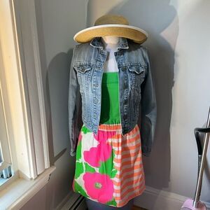 Beautiful like new Cappelli Straworld Face Saver Sunhat.raffia/paper/strawbrimmed sunhat with white band and edging. Golf flower logo on right side. Adjustable velcro sizing in back. Height 4”, Brim 3.5”. 75% paper, 25% poly. Thought I would look cute, but I guess I am not a hat person. Only worn a couple times! #cappelli #sunhat #vacamode