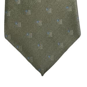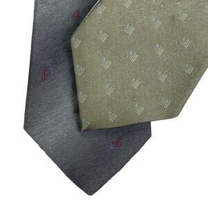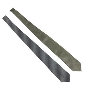 A pair of beautiful shimmery men's neckties in green and silver, each with a subtle geometric pattern. Alfani - Made in Italy. 35% Silk 65% Nylon. Cappuccino - Made in USA - No Materials tag. Due to light & screen variations, colors may vary slightly from the images