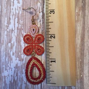 Pale pink top, coral center, red bottom earrings. 3" long when hanging from ear.