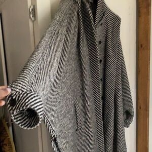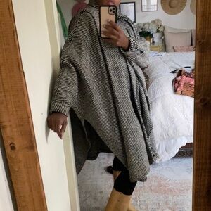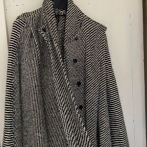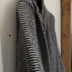 Vintage black and white cape size OS snap button down comes with attached scarf feels like wool doesn’t have a label stating what it’s made of.
