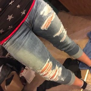 Dark wash & medium wash SUPER STRETCH distressed capri's, still like new, lost weight shortly after they were bought they haven't been worn in over 2 months and they're only 7 and a half months old!!! Stretchy material, super comfortable!! And very cute!!