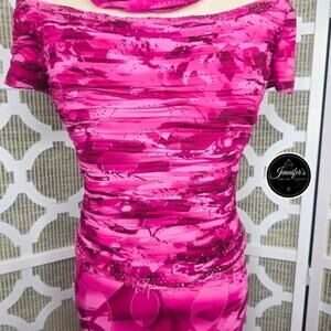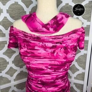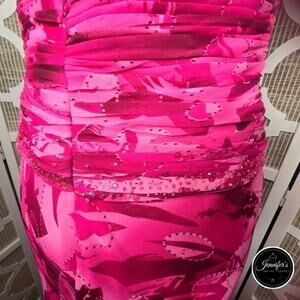 Capri by Mon Cheri Hot Pink Ruched Beaded Bodice A-Line Flared Long Dress 10/12