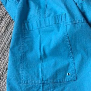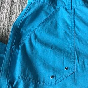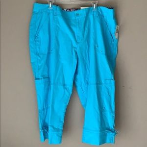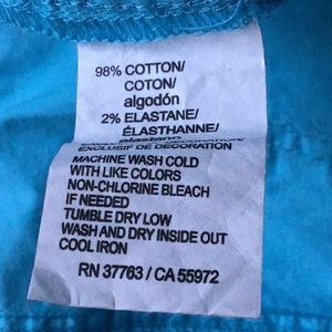 Cute Capri pants. Color on tag is: fusion blue. I would call the color turquoise. 2 large front pockets, 2 pockets in the back and a pocket on each leg. The bottom has small side slits and a tie. Inside waist has a pretty floral pattern. So many nice details! Approximate measurements: waist 22” and inseam 22 1/2. The tag on back says: modern fit, lower rise, straight hip. Lightweight 98% cotton, 2% Elastane (for stretch.)