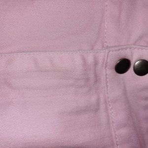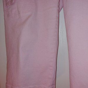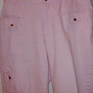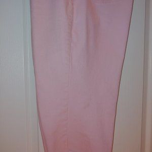 Classy capri pants in a soft pink color. They are made of 98% cotton with 2% spandex which gives them a very comfortable fit and easy care. Bottom legs can also be worn folded and cuffed. Front zipper with 2 snaps at the top. Can be worn with or without a belt.