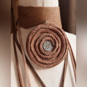 I have a passion for collecting ,refinishing transforming , sewing,painting,photography & up-cycling.Pieces are either mine,my collectibles,altered pieces,estate pieces or flea market finds & for this reason will be sold as is. Two piece set Capricorn . All hand cut Italian suede and leather. Attached to a large metal medallion backed with hand cut Italian leather in a pumpkin color. The Capricorn coin & rustic findings are purposefully aged . Signature vintage spiderwear charms hang in back of neck when fashioned. Hand cut Italian leather and rustic beads complete the matching earrings. 13 1/2” choker and 4”L lightweight earrings. Necklace and earrings only this listing. Other necklaces are listed separately and shown for stylin references only