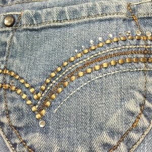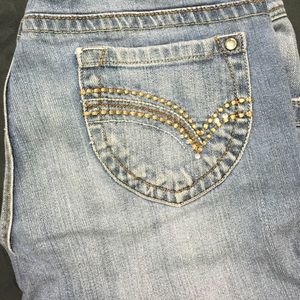 Stones are missing from back pocket. Never worn. Given as a gift. No rips or tares.