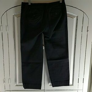 Black cotton with slit front pockets, button back pockets and cuffed legs