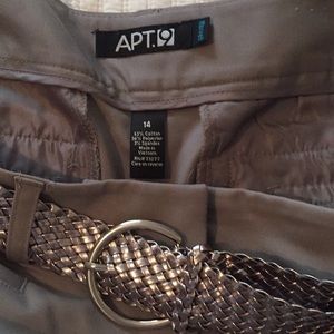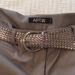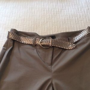 Beautiful gray with silver belt capris pants that can be worn dressed up or down. Made of combination of poly, cotton and spandex. Looks great with silver or black blouse