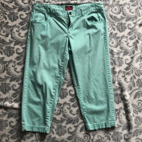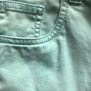 Pretty light teal colored capris. Small stain near front pocket (pictured). Merona brand size 6. Stretch extensible fit3 coupe3
