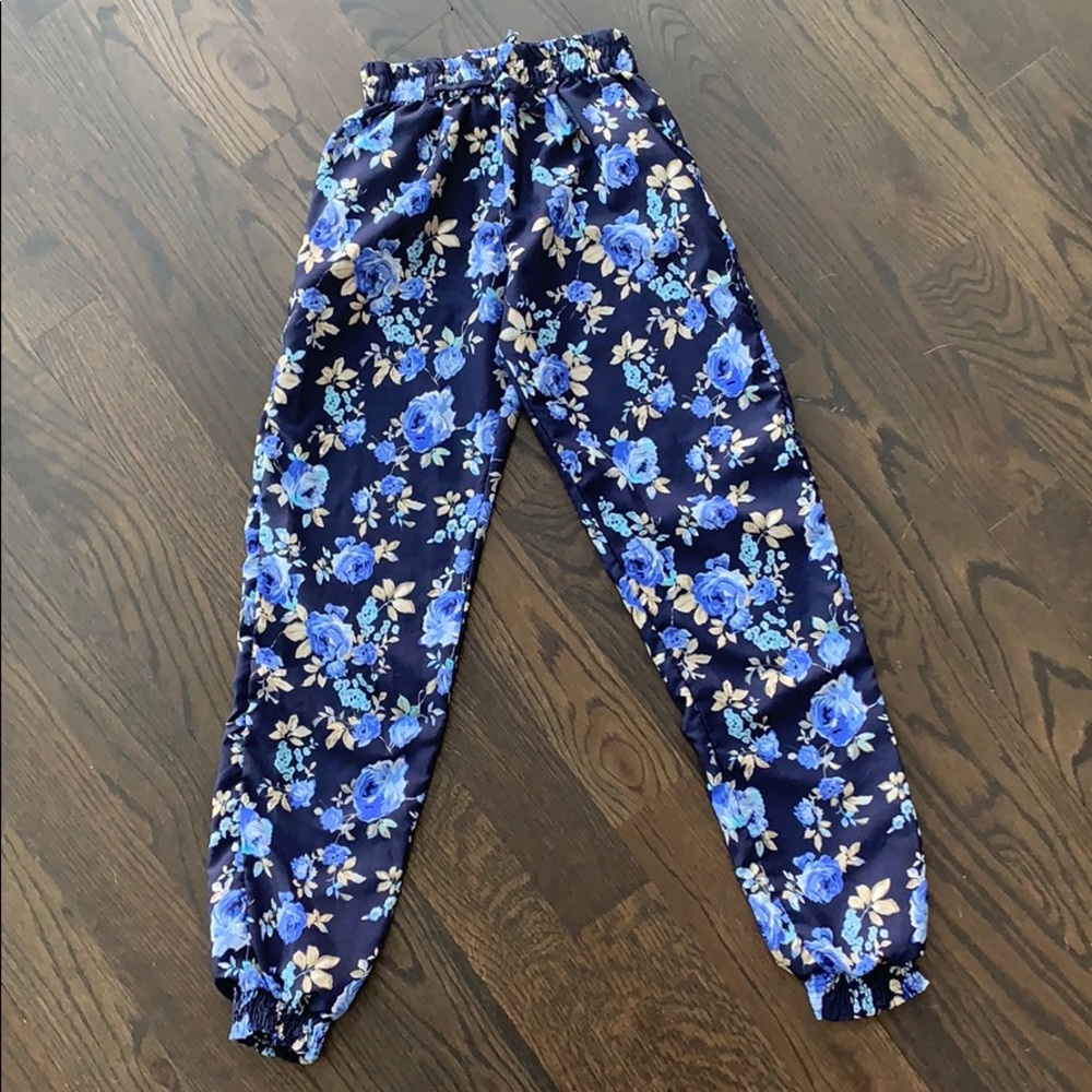 Thin, satin silk like summer material with a blue floral print. Two pockets in the front with an elastic waist. Not a stretchable material.