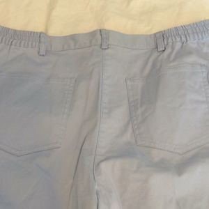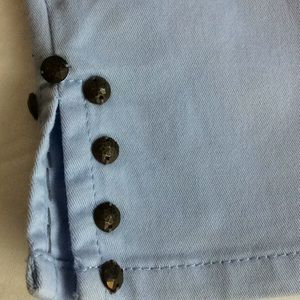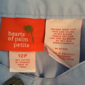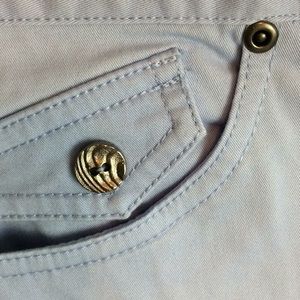 Petite size 12 with brass style embellishments elastic waist belt loops and four pockets with a change pocket in excellent condition one little spot probably can’t be removed will need to see in pictures wonderful denim material lightweight for the hotter months